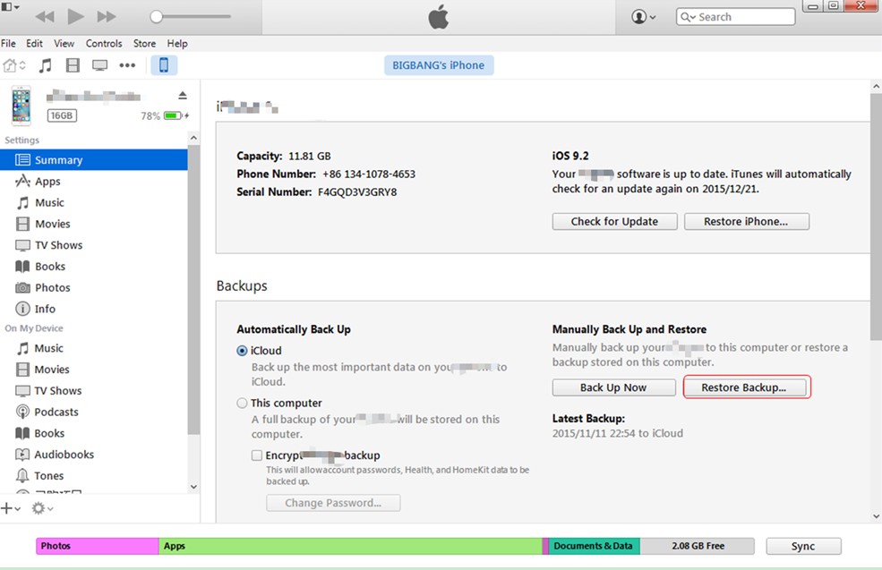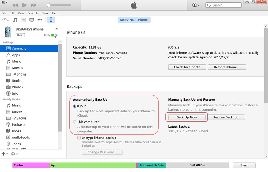 步骤3: iTunes 将帮助您将 iPhone 备份到电脑。等待一段时间,直到 iTunes 完成整个备份过程。