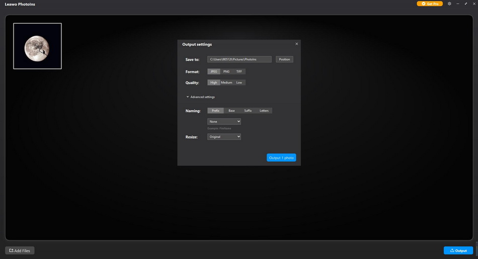 选择好所需的效果并将 AI 增强功能应用于所选的月亮照片后,点击右下角的输出图标进行输出设置。在输出设置面板中,您可以完成以下设置:“保存到”路径、“格式”、“质量”、“命名”、“调整大小”等等。最后,点击“输出”将增强后的照片导出到电脑。