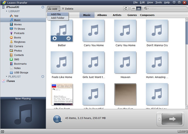 Leawo iTransfer 是您能用的最佳 BlackBerry 到 iPhone 传输应用。它可以帮助您高效管理各种文件,并有效解决各种传输问题。这里,我想以音乐为例,向您展示如何使用这款出色的 BlackBerry 到 iPhone 传输应用将数据从 BlackBerry 传输到 iPhone。