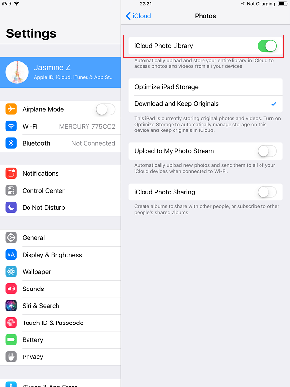 步骤1. 在iPad上打开“设置”,然后点击“iCloud”>“照片”,然后打开“iCloud照片图库”。当有Wi-Fi可用时,这将自动将您的整个图库上传并存储在iCloud中。