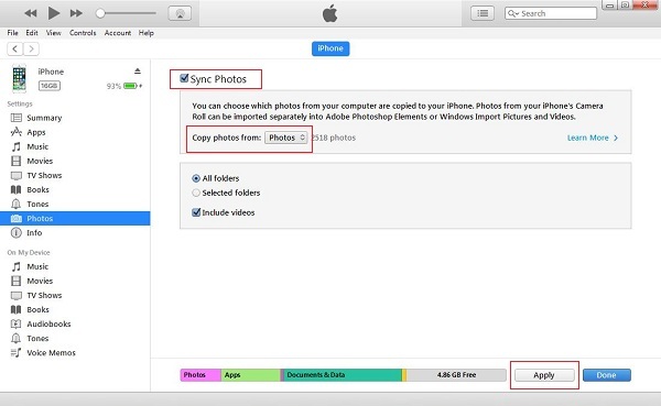 步骤3. 单击iTunes界面右下角的“应用”,iTunes将把照片从电脑同步到您的iPad。