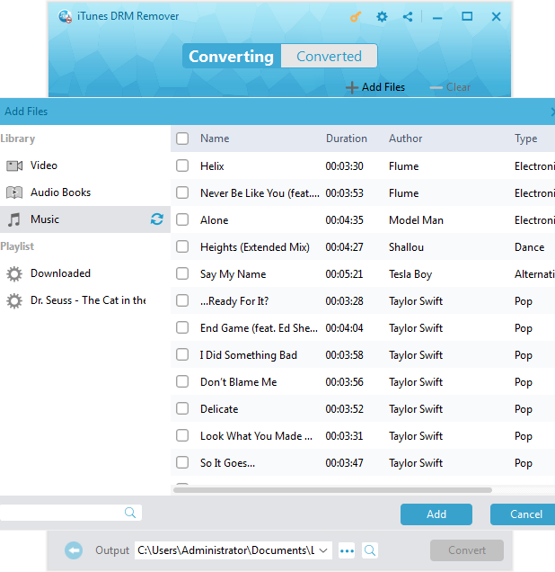 点击底部第一个添加按钮导入受 DRM 保护的 iTunes 音乐,或者您也可以通过拖放操作将想要转换为华为 Mate 10 兼容格式的 iTunes 音乐导入到音频 DRM 移除工具中。