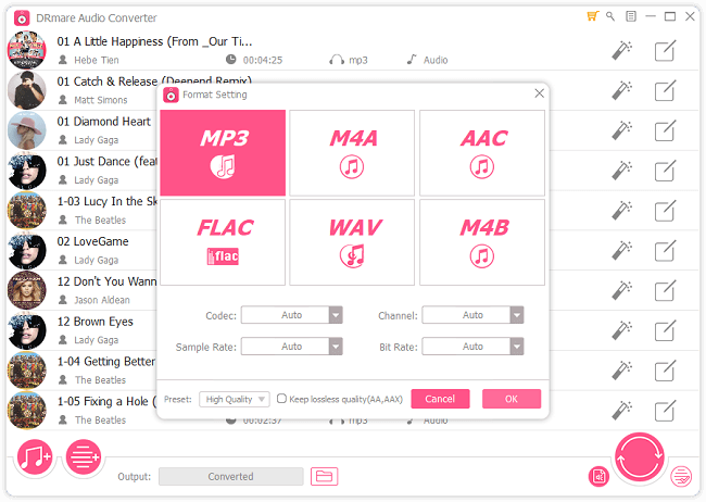除了 Leawo Prof. DRM,你也可以使用 Drmare DRM 音频转换器 要移除 DRM 并将 iTunes 音乐传输到华为 Mate 10,Drmare DRM Audio Converter 是一款智能的 DRM 移除软件和音频转换器,可以帮助您获取无 DRM 保护的音频曲目、iTunes 热门歌曲、播放列表和专辑。它可以轻松绕过 iTunes 音乐的 DRM 保护,并将受 DRM 保护的音乐转换为其他格式。 MP3支持将音乐转换为 M4A、AAC、WAV、FLAC 等格式,并保留原始音质。借助这款功能全面的 DRM 音频转换器,您还可以轻松地将 iTunes 音乐转换为华为 Mate 10 兼容的格式。