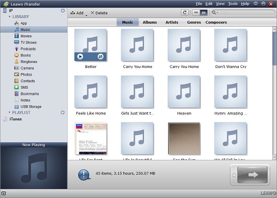 如何在没有 iTunes 的情况下将音乐传输到 iPad?正如我们上面提到的,iTunes 只能在两台设备之间传输购买的音乐和免费音乐。有什么工具可以帮助解决如何在没有 iTunes 的情况下将音乐传输到 iPad 的问题吗?有的, Leawo iTransfer 正是您需要的工具。 Leawo iTransfer 界面简洁流畅,即使是新手也能快速上手。它支持在 iTunes、iPad、iPhone、iPod 和电脑之间传输音乐、应用程序、视频、图片、电视节目等。无论购买还是非购买商品, Leawo iTransfer 轻松帮你解决这个问题。让我们直接进入正题,学习如何在没有 iTunes 的情况下将音乐传输到 iPad,但 iTransfer.
