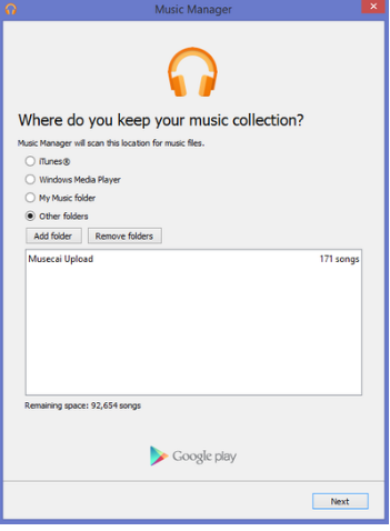 步骤4: 它会询问您音乐收藏的存放位置。选择用于保存无 DRM 保护的 iTunes 音乐的目录,然后点击“下一步”。之后,管理器将遍历您的 iTunes 资料库,并将您的歌曲和播放列表上传到 Google Play。