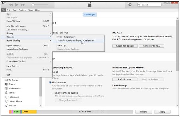 3. 现在转到文件 > 设备 > 从 iPhone 传输购买内容。将弹出一个框,只需输入您的 Apple ID。之后,它将开始将音乐从手机复制到 iTunes 资料库。完成后,您可以在 iTunes 资料库中查看所有购买的音乐。