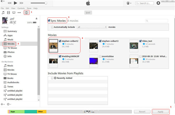 5. 然后,点击右下角的“应用”按钮,将音乐视频文件从 iTunes 电影库同步到 iPod。