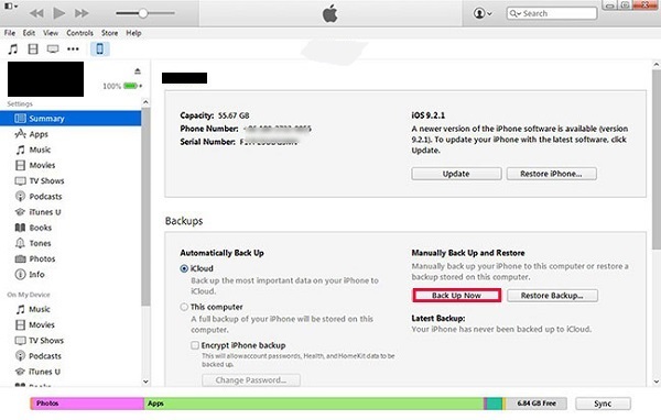 2. 点击 iPad 图标,然后转到左侧边栏的“摘要”。在“备份”下选择“立即备份”。之后,iPad 信息将同步到 iTunes。