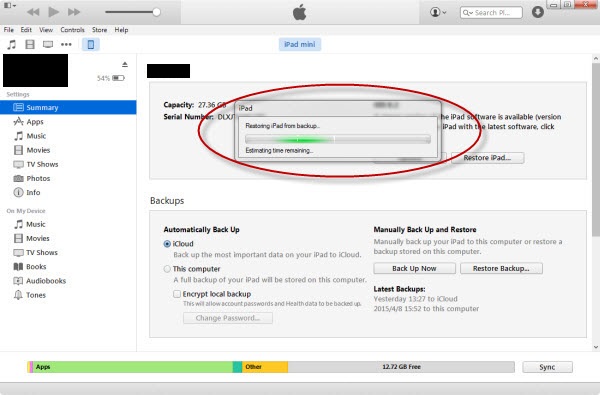 3. 现在断开旧 iPad 的连接,并将新 iPad 连接到电脑。您会在左上角看到一个 iPad 图标。点击该图标,然后依次选择“摘要 > 恢复备份”。选择最新的备份,它会将旧 iPad 上的信息(包括您想要恢复的应用程序)备份到新 iPad。这样,您就可以将数据从旧 iPad 传输到新 iPad。
