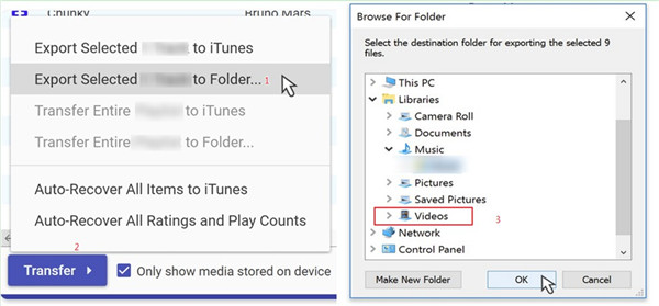 4. 将会弹出一个对话框,您需要选择“将选定项目导出到文件夹”。点击“传输”按钮,然后您可以浏览您的电脑,设置导出的 iPad 视频的保存位置。