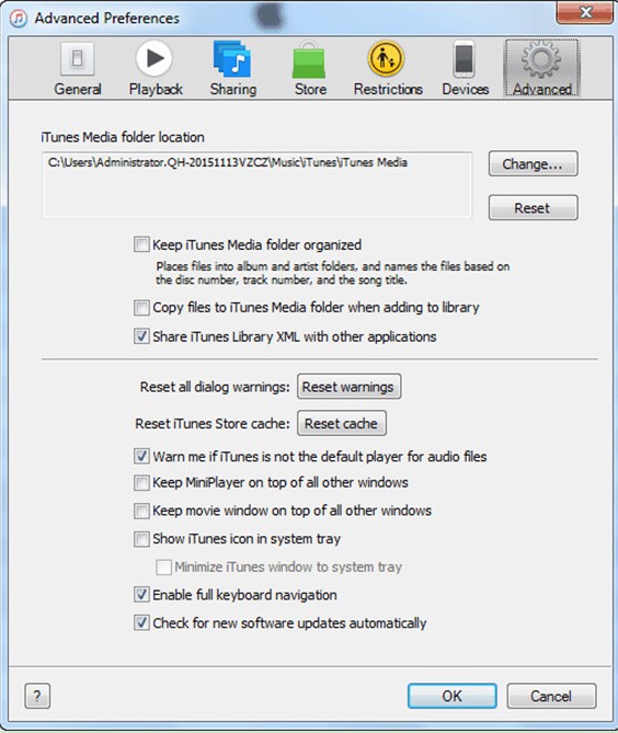 b) 单击“高级”选项卡,然后 iTunes Media 文件夹的位置将显示在“iTunes Media 文件夹位置”选项下。