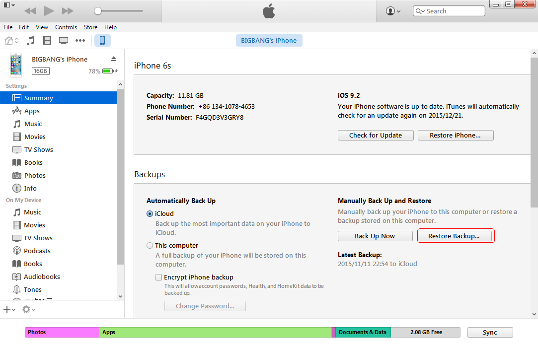 c.点击右侧的“恢复备份”,iTunes 将开始备份您的设备。