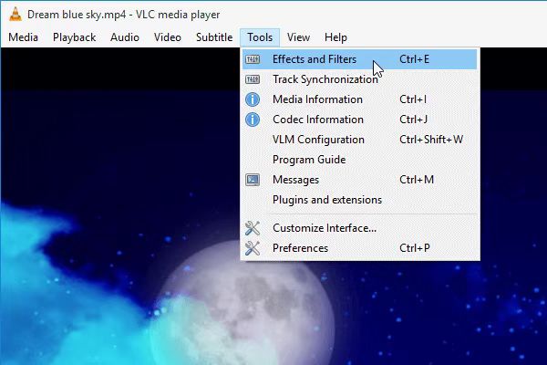 下载此程序后,点击 相关媒体 要将源视频文件加载到播放器中,或者您可以直接将源视频文件拖放到此处。点击 工具 > 效果和滤镜 进入下一步的窗口。