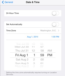 步骤 1. 众所周知,安装任何外部来源的应用程序都需要“约会技巧”。点击 设置>>常规>>日期和时间设置,然后滑动 自动设置 选项到关闭位置,并将日期设置为 2014 年 8 月 1 日.