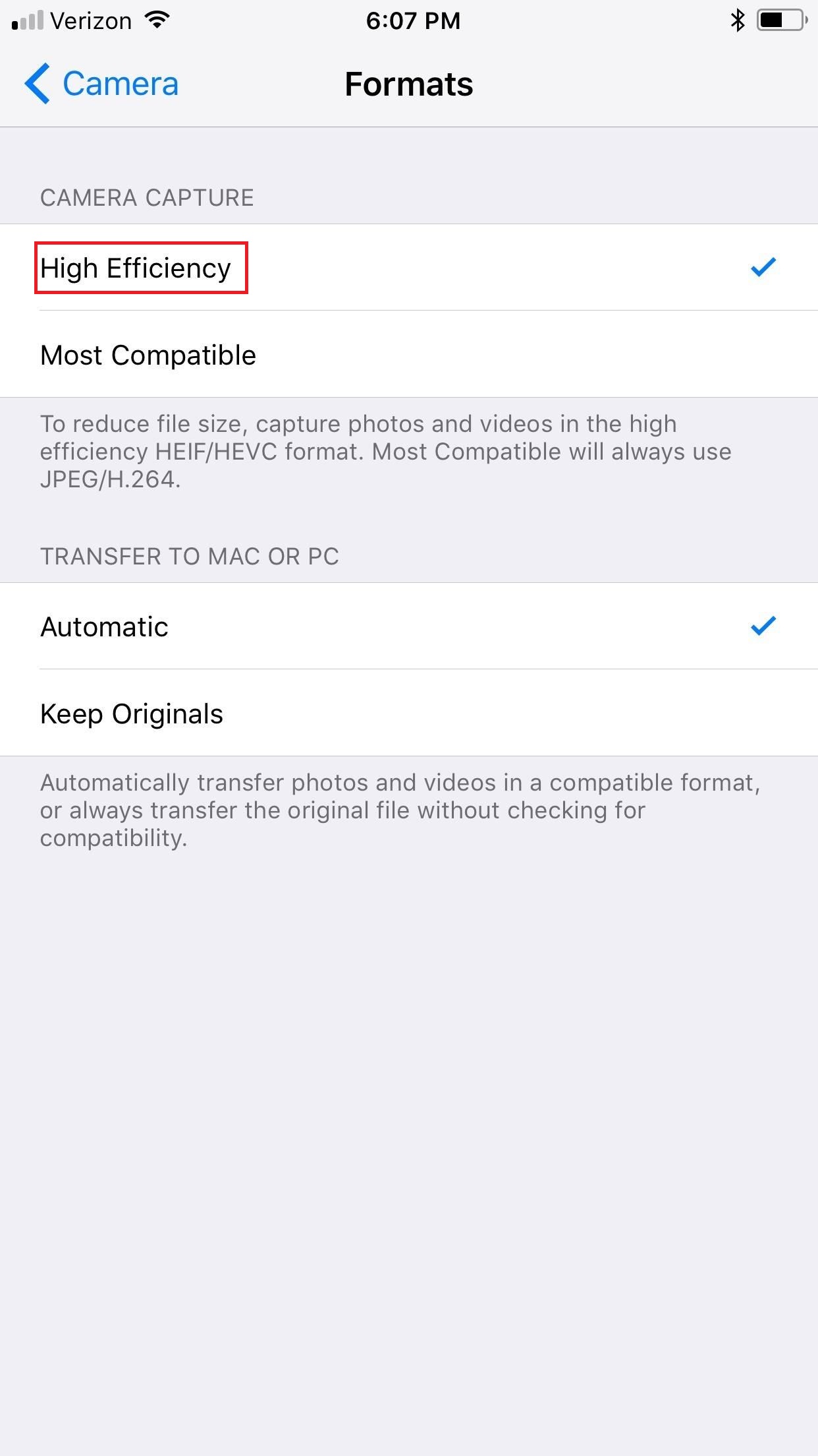 iOS 11 相机应用的一大亮点在于其照片和视频的全新压缩方法。照片和视频会在 iPhone 内部进行压缩,从而节省约一半的存储空间。换句话说,您可以拍摄与以往相同画质和清晰度的照片和视频,同时节省约一半的存储空间。这样,iPhone 便有更多存储空间用于安装和启动应用程序。只需在 iOS 11 相机设置中按照几个步骤操作,即可充分利用新的压缩方法。前往“设置”->“相机”->“格式”,然后确保勾选“高效”选项卡。之后,视频将保存为 HEVC.MOV 文件,照片将保存为高效图像文件格式 (HEIF)。因此,存储空间将显著节省。