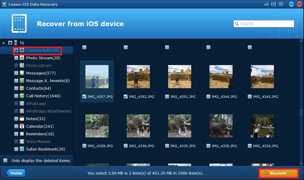 步骤4. 扫描完成后,窗口中将显示您iPhone上的14种数据。勾选“仅当照片已删除时显示已删除项目”选项卡,窗口中显示的数据类型仅限于已删除项目。在界面左侧面板上选择“相机胶卷”,并在右侧面板上勾选要恢复的照片名称,然后单击“恢复”按钮。