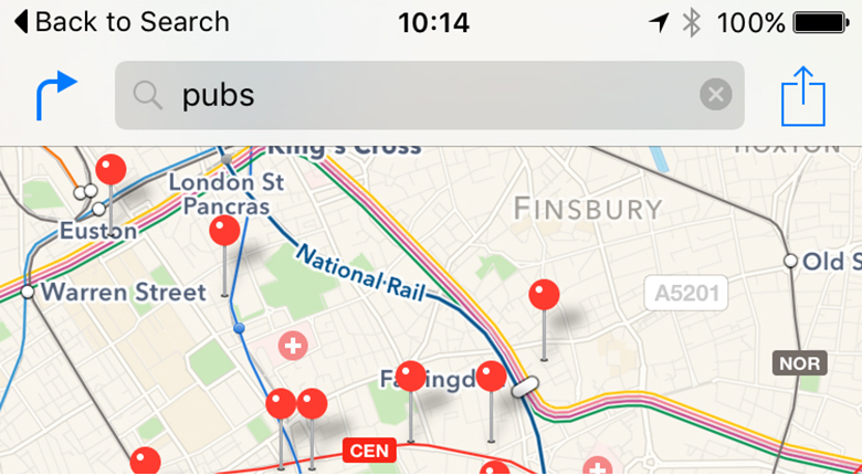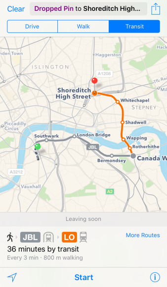 iOS 9 中的地图功能也得到了增强。现在,地图应用可以为您提供沿途的公交和公共交通信息。