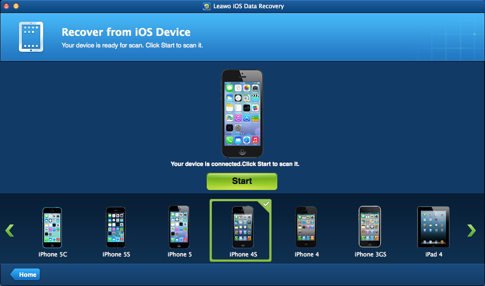 1。 运行 Leawo 在 MacBook 上安装 iOS 数据恢复软件后,选择“从 iOS 设备恢复”。通过 USB 数据线将 iPhone 连接到 MacBook。软件将自动检测 iDevice,然后窗口中间会出现一个“开始”按钮。
