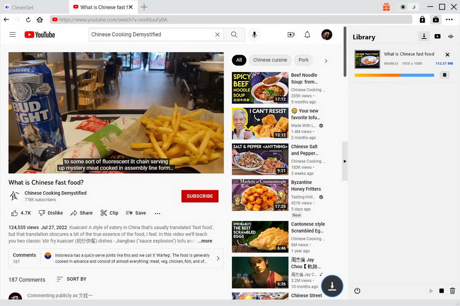 通过 CleverGet 视频下载器,只需单击几下即可下载您最喜欢的中式烹饪教程作为离线烹饪指南。这是最出色的软件,可让您在播放器中观看 YouTube 视频并同时下载。立即开始您的中式烹饪之旅 CleverGet 视频下载器。利用方便的离线烹饪视频教程,在家制作您最喜爱的中餐。