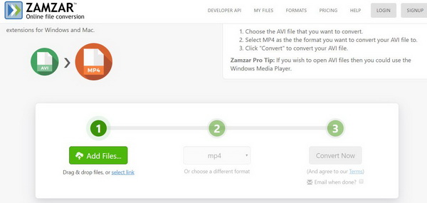 除了 Leawo 视频转换器,还有其他可行的方法,例如当您无法在索尼电视上播放 AVI 文件时,使用在线视频转换器将 AVI 转换为可在索尼电视上读取的格式,其中 Zamzar 是最受欢迎的。Zamzar 是一款免费的在线转换器,允许用户将 AVI 文件转换为各种其他格式,例如 AVI 转换为 3gp、FLV、MP4、MPG、WebM、WMV 等等。要在索尼电视上播放 AVI 文件,您可以访问 Zamzar 页面,通过简单的步骤将 AVI 转换为索尼电视兼容的格式。