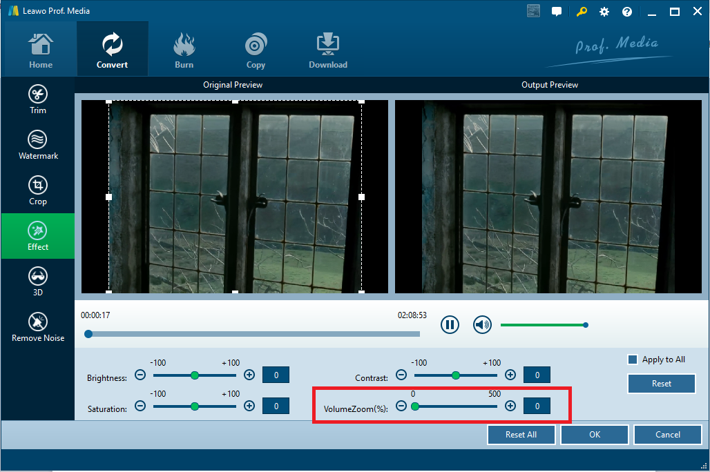 点击 影响 ,并将音量设置为零,以便制作静音视频。单击 OK 退出此页面。