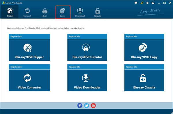 步骤 1。 下载 Leawo Prof. Media 首先在你的电脑上, Leawo Prof. Media 是一款综合转换器套件,包含蓝光/DVD 翻录器、蓝光/DVD 制作器、蓝光/DVD 复制器、视频转换器、视频下载器和蓝光 Cinavia 等六个模块。启动此程序后,您将进入“主页”界面。