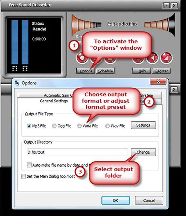 步骤2: 点击“选项”按钮进入“选项”选项卡。输出格式包括 MP3您可以通过“常规设置”指定 WAV、WMA 和 OGG 格式。点击“设置”按钮,即可使用预设的良好配置或自定义配置参数来调整录音质量。点击“更改”按钮可以选择保存录制音频文件的目标文件夹。录制的音乐文件还可以根据日期和时间自动命名。