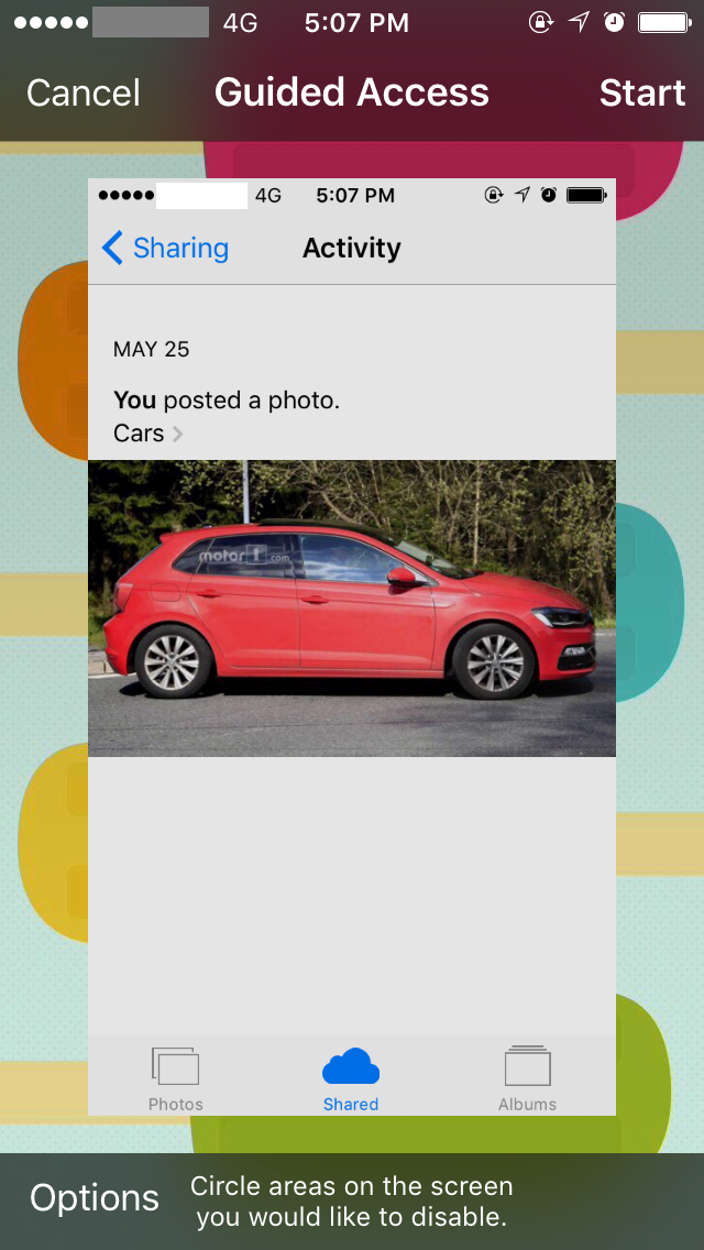 第一步现在您已经激活了 引导访问您可以打开一个应用程序,然后三击主屏幕按钮来使用它。 引导访问。 龙头 可选项 点击左下角可查看更多选项。您可以禁用此功能。 睡眠/唤醒按钮、音量按钮、运动感应器、键盘 与 联系 并设置 时限.