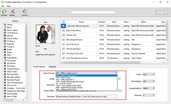 3. 点击“输出格式”并选择 MP3 作为输出格式,然后单击“转换”将 Apple 音乐转换为 MP3.