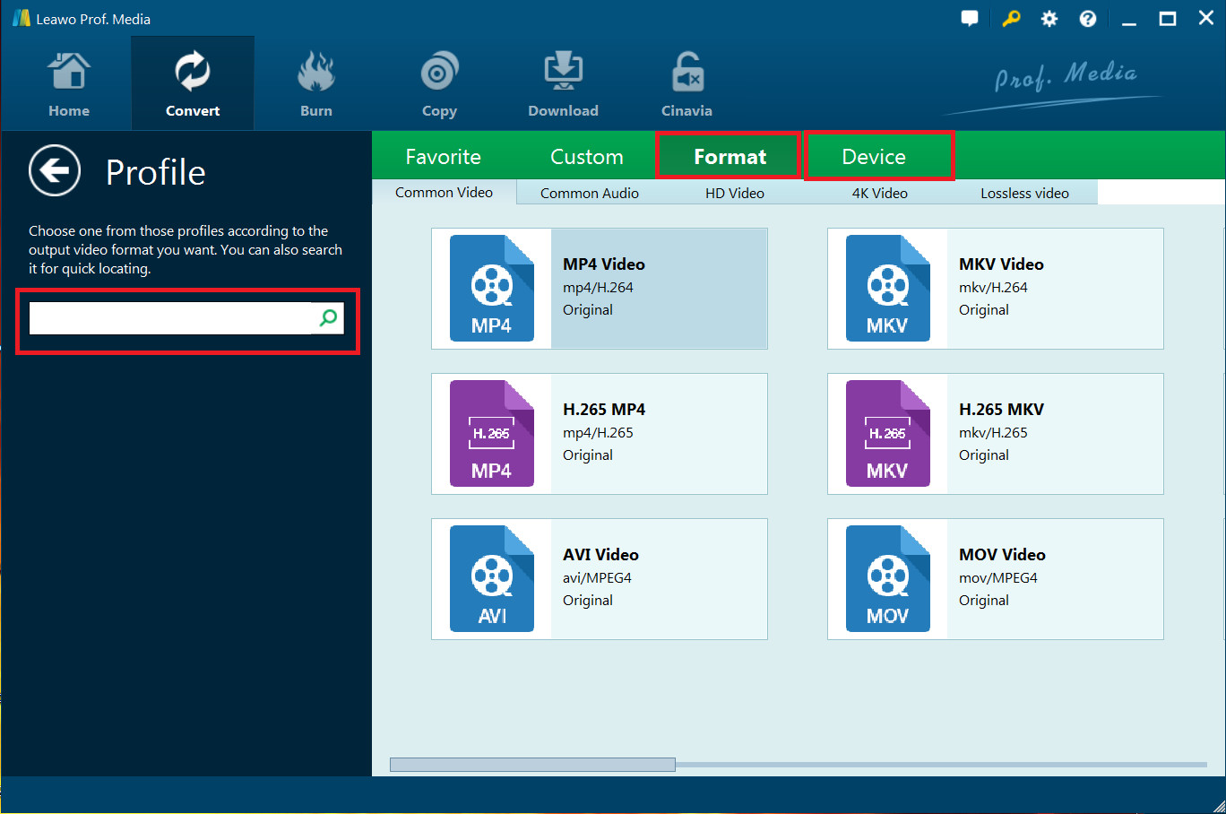 步骤 2。 点击“MP4 视频”>>“更改”>>“配置文件”面板,在“格式”或“设备”组下,选择视频/音频格式或移动设备作为输出配置文件。选择 Emby Media Server 能够良好识别的 MP4 视频。MKV 也是一个不错的选择;作为容器格式,它会接受你提供的任何格式。如果你想将 DVD 电影从 Emby Media Server 串流到其他设备(例如 Android TV), Amazon Fire TV、Chromecast Ultra、Roku、Xbox、家庭影院电脑等,您可以根据自己的需要选择所需的数字文件格式之一。