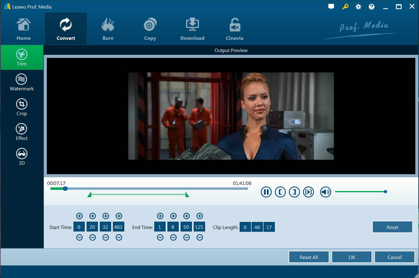 步骤 4。 编辑源媒体文件,例如修剪、裁剪、添加水印、调整视频效果或应用 3D 效果方面,您可以点击文件末尾的“编辑”图标进入视频编辑面板。在“修剪”部分,直接拖动滑块即可修剪视频长度。修剪后的长度会立即显示。您可以重置长度或点击“确定”进行确认。