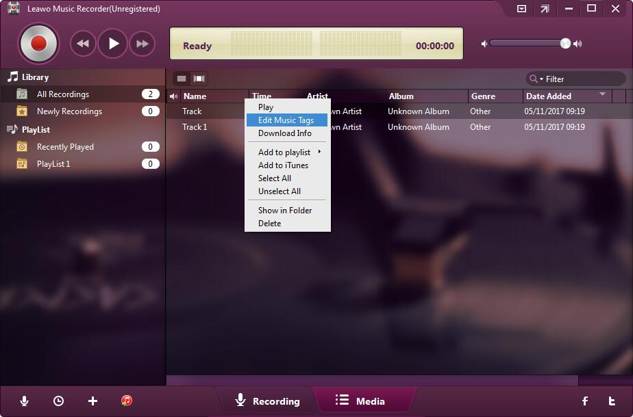 如果你正在录制一首歌曲, Leawo 音乐录音机会自动帮您添加并完善音乐标签,例如艺术家、专辑、流派、封面等。您可以在“媒体”库中查看这些信息。此外,它还允许您手动编辑这些音乐标签,只需右键单击目标录音,然后选择“编辑音乐标签”选项即可。