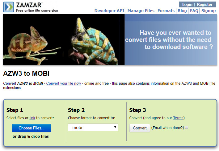 以下步骤将向您展示如何借助这款免费的在线 AZW3 转 Mobi 转换器——ZAMZAR,在线免费将带有 DRM 保护的 AZW3 文件转换为 Mobi 文件。