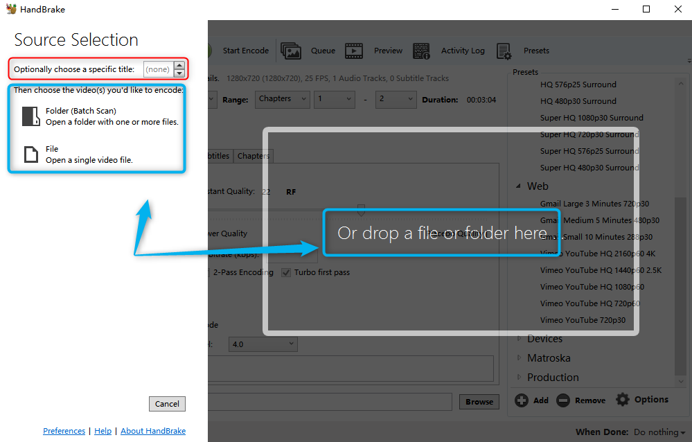 步骤1: “源选择”面板是您使用 Handbrake 进行蓝光文件到视频转换的地方。它允许您在选择文件夹/文件之前选择特定标题。添加蓝光文件的一种方法是将文件/文件夹拖放到指定区域。另一种方法是点击“文件夹(批量扫描)”按钮或“文件”按钮上传文件/文件夹来添加蓝光文件。