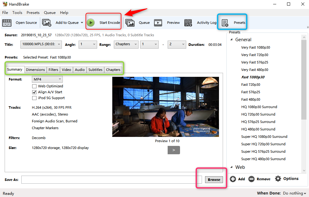 步骤2: 正如您在下图中看到的, Handbrake 有时在蓝光转换之前需要调整蓝光格式。因此,您可以选择预设面板(如图所示,绿色和蓝色标记)。这些面板可以帮助您优化视频,无论其质量和兼容性如何。此外,您可以方便地将输出视频保存到计算机上的任何文件位置。点击“浏览”按钮,即可在计算机上自由设置保存位置。所有操作完成后,点击“开始编码”按钮,即可将科幻电影转换为蓝光格式。