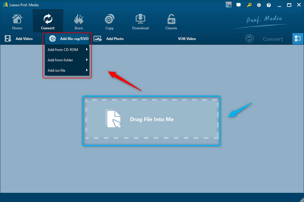 步骤2: 它可以通过两种方式添加蓝光文件:您可以将文件拖放到给定区域,或单击“添加蓝光/DVD”按钮。 Leawo Blu-ray Ripper 允许三种文件源输入,从 CD-ROM 添加蓝光、从文件夹添加蓝光或从 iso 文件添加蓝光。