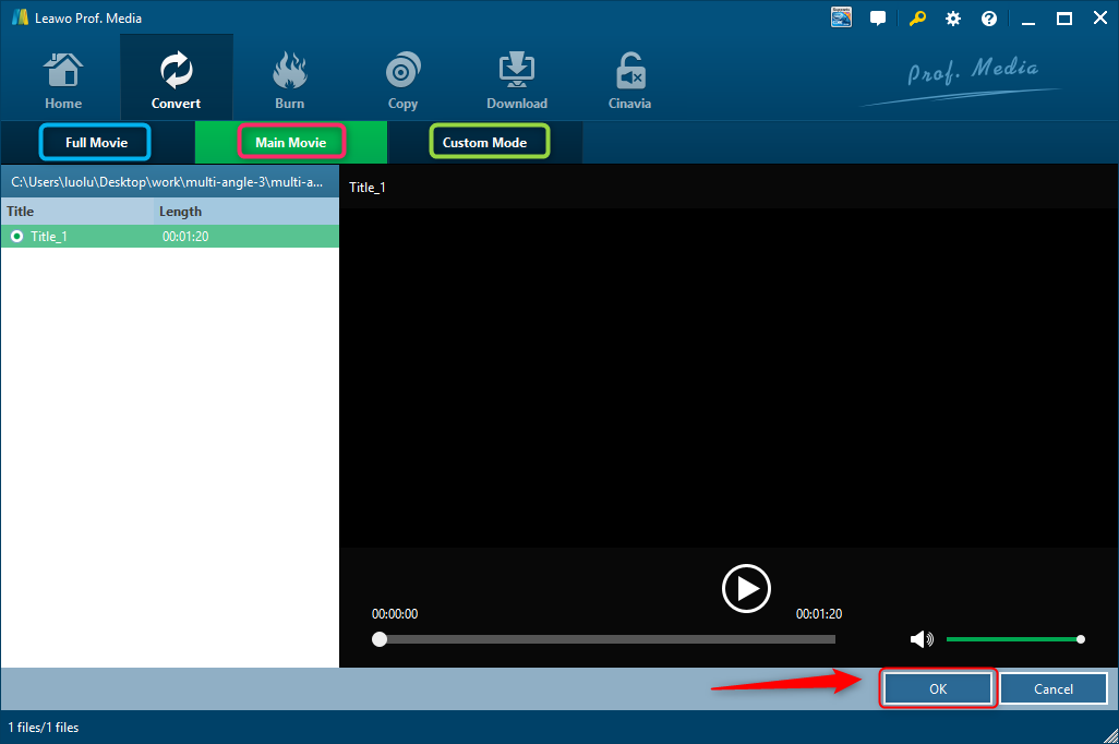 步骤3: 成功添加蓝光文件后,您将看到一个页面,让您选择需要从蓝光文件中输入的影片数量。有三个选项。“完整影片”是从蓝光文件中选择所有影片;“主影片”表示默认选择最长的影片;“自定义模式”允许您自行选择影片。完成此步骤后,点击“确定”按钮进入下一步。