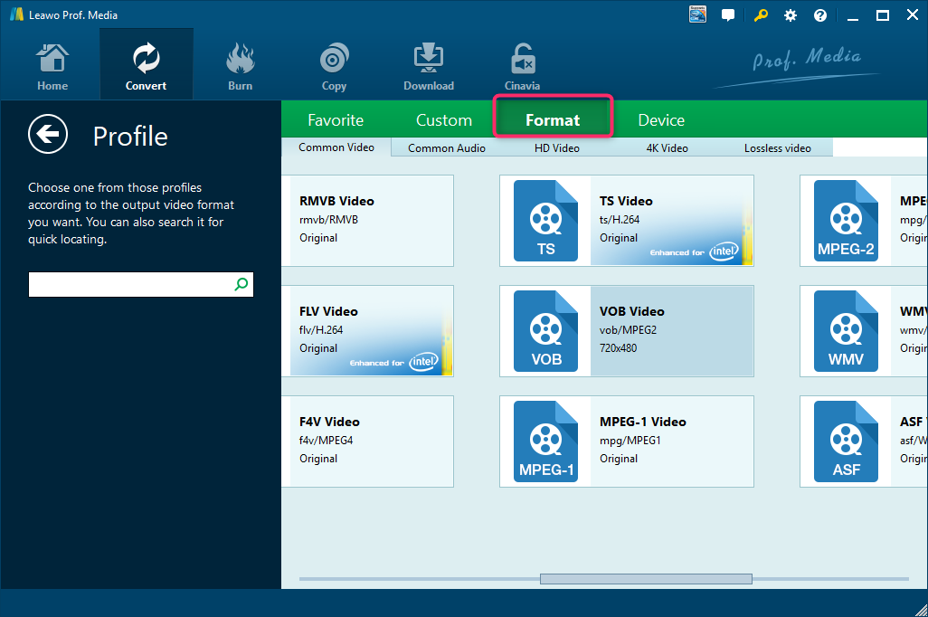 步骤4: 您可以通过单击“更改”按钮来选择不同的输出视频,以选择您想要的蓝光转换格式。结束 180+ 可选择视频/音频格式。您将进入“配置文件”面板。“格式”部分包含您需要翻录蓝光光盘的所有视频格式。它包括普通视频、高清视频、 4K 视频和无损视频超过 180+ 选择性格式。
