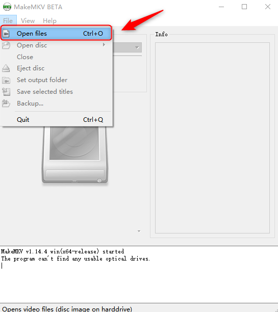步骤1: 点击MakeMKV首页右上角的“文件”按钮,选择“打开文件”即可添加蓝光。