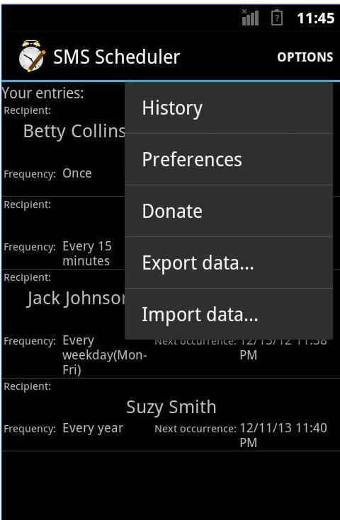 在短信调度程序的主屏幕上,您可以看到有关短信发送的信息,包括指定的收件人、发送频率以及下次发送短信的日期和时间。短信调度程序无疑是一款简单的工具,可以按选定的频率自动发送短信。此外,在短信调度程序主屏幕的菜单中,您还可以选择“首选项”选项,该选项可让您启用/禁用通知和会话插入功能。