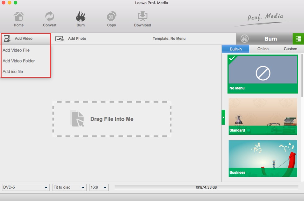 开始 Leawo Prof. Media 在 Mac 电脑上,然后打开“刻录”模块。然后您需要添加要刻录的源视频。最简单的方法是直接将视频拖放到程序中。或者,点击“添加视频”导入视频。之后,根据您插入的空白 DVD 设置 DVD 类型。