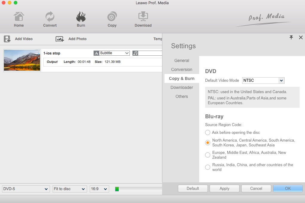 您可以进入“首选项”页面,选择“默认视频模式”和“DVD 区域码”。点击菜单上的“首选项”,然后点击“复制和刻录”,在这里您可以选择刻录 DVD 的格式。