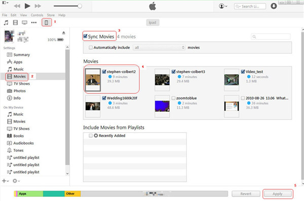 4. 当 GoPro 视频位于 iTunes 资料库中时,您需要单击 iPhone 图标,然后转到“设置 > 摘要 > 电影 > 同步电影”选项卡,将 GoPro 视频从 iTunes 资料库同步到 iPhone。最后,点击右下角的“应用”按钮开始同步过程。