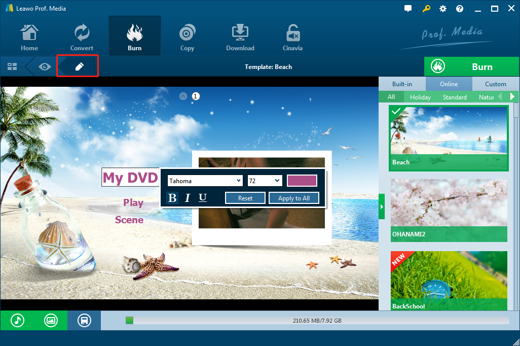 Leawo DVD Creator 为您提供多个预设的光盘菜单模板,主题涵盖标准、商务、教育、童真、假日等,您可以根据需要在右侧选择合适的模板。您可以点击右侧边栏中光盘菜单模板的中间,进入光盘菜单预览窗口。在光盘菜单预览窗口中,只需点击铅笔图标即可设计光盘菜单,添加您自己的背景音乐/图片/视频,调整标题内容/颜色/字体/大小等。