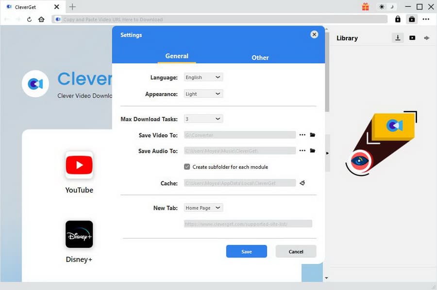 CleverGet 允许自定义更改默认设置。您可以点击三个点图标,然后点击“个人设置”选项进入“个人设置”窗格可在“将视频保存到”框中更改输出目录。此外,您还可以更改其他设置,例如程序 UI 语言、外观、最大下载任务等。点击“已保存”按钮完成所有设置。
