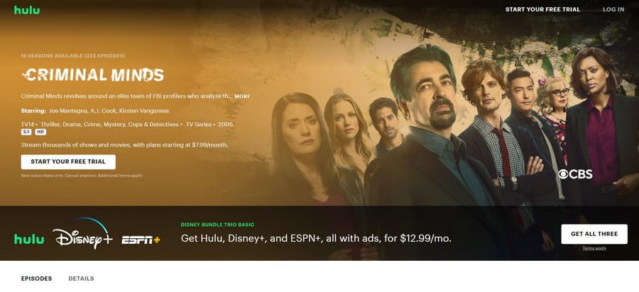 Hulu 目前是可以在线观看《犯罪心理》的顶级流媒体平台之一。作为一项重要的订阅流媒体服务, Hulu 提供数千部热门节目和电影,来自 20 世纪影业、探照灯影业等知名影业公司, Disney 电视工作室、ABC 等,以及 Hulu 原创节目。《犯罪心理》15季可在 Hulu. 要在 Hulu,您可以选择每月仅需 7.99 美元且支持广告的订阅计划。 Hulu 还提供无广告计划,每月费用为 14.99 美元,让您可以观看大多数相同的节目和电影,而不会出现广告。