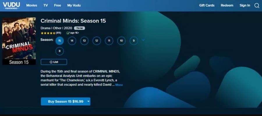 Vudu 是一款热门的视频流媒体服务,您可以租借、购买和观看数以万计的电影和电视节目。在这里,您还可以观看《犯罪心理》15 季的全部剧集。请注意,《犯罪心理》目前在美国的 Vudu 上线。在美国以外地区观看这部剧集需要 VPN。此外,购买该剧集每季的剧集大约需要 16.99 美元。Vudu 还提供每集 1.99 至 3.99 美元的套餐。