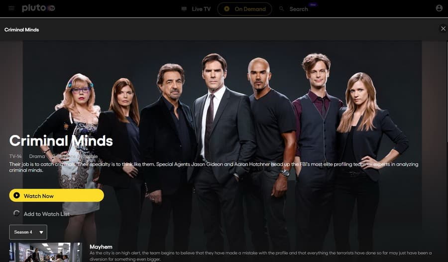 Pluto TV 是一款完全免费且包含广告的流媒体服务,提供数千部电影和电视节目。您甚至无需注册或登录即可观看热门电影或最新剧集。《犯罪心理》目前有三季可供在线观看。 Pluto 电视完全合法且免费,您可以随意观看该节目的剧集。