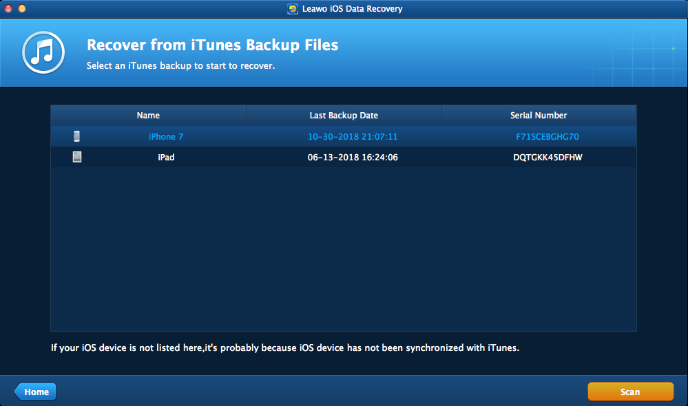 iTunes 中的备份将显示在窗口中。选择一个备份并单击 “扫描”