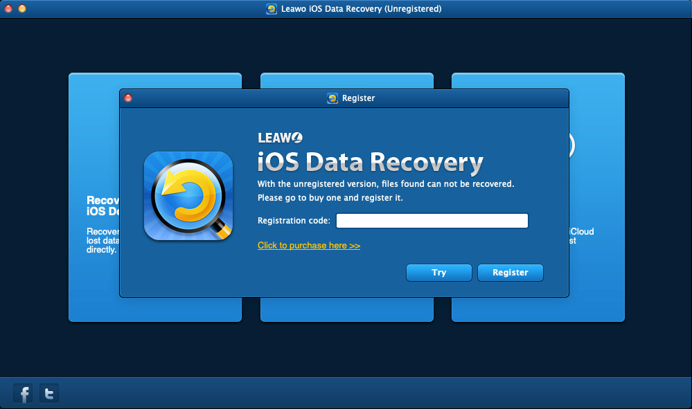 步骤 1。 将此 iOS 数据恢复程序安装到您的 Mac 后,第一次打开该程序时,会弹出一个窗口提示您注册该程序。